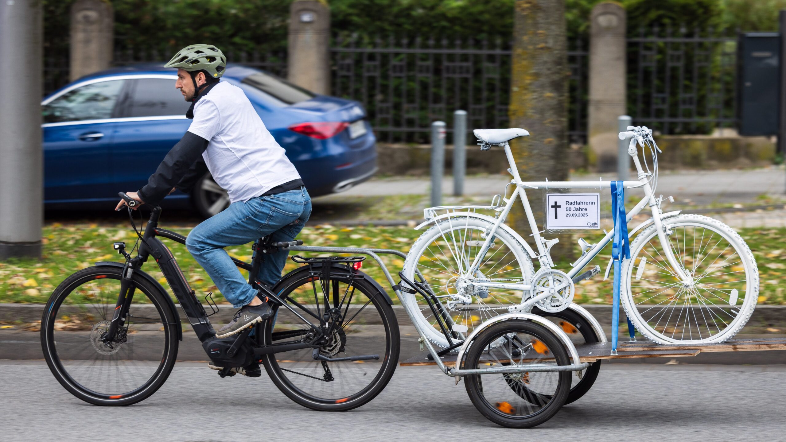 Radfahrer mit einem Anhänger, auf dem ein vollständig weiß lackiertes Fahrrad befestigt ist. Am Rahmen des weißen Rades ist ein laminiertes Blatt Papier, das mit einem schwarzen Kreuz und dem Text "Radfahrerin - 50 Jahre - 29.09.2025" bedruckt ist, befestigt.