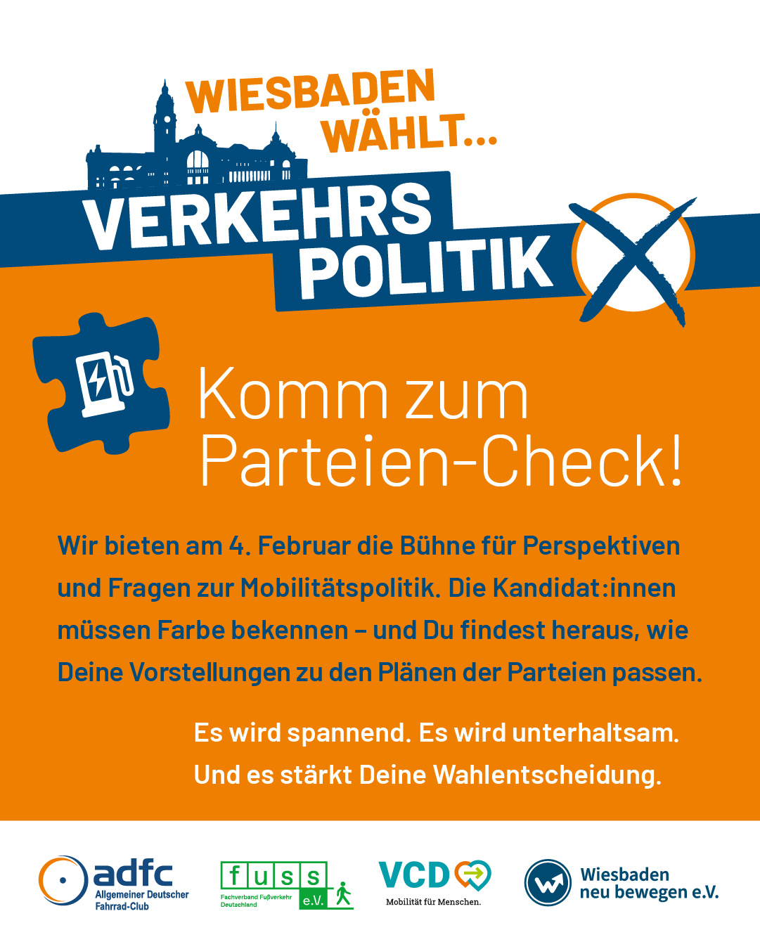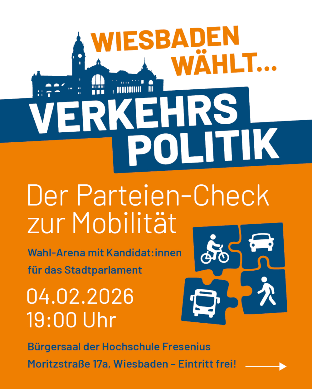 Zu dieser wichtigen Frage organisieren vier Wiesbadener Vereine am 4. Februar einen informativen, kurzweiligen Politik-Abend. Gemeinsames Ziel: Mit den mobilitätspolitischen Sprechern der Parteien konstruktiv in die Zukunft der Mobilität in Wiesbaden schauen, konkrete Positionen zu verschiedenen Verkehrsthemen abklopfen – und am Ende genauer wissen, wo man am 15. März das Kreuzchen machen möchte.