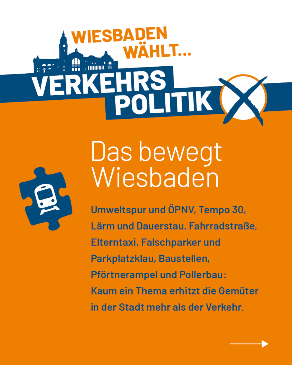 Umweltspur und ÖPNV, Tempo 30, Lärm und Dauerstau, Fahrradstraße, Elterntaxi, Falschparker und Parkplatzklau … Verkehrspolitische Themen werden in Wiesbaden heiß diskutiert – in der Stadtpolitik ebenso wie von den Menschen selbst.
