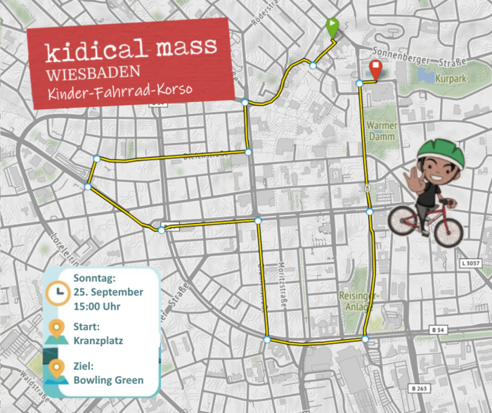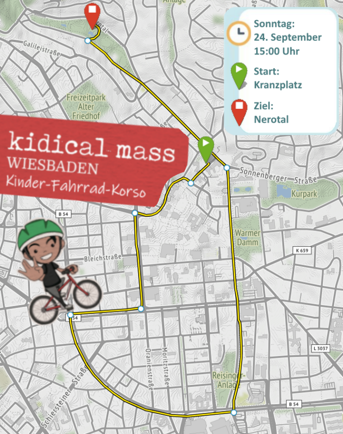 Die dritte Kidical Mass Wiesbaden 2025 findet am 21.09. um 15:00 Uhr im Rahmen der weltweiten Kidical-Mass-Aktionstagen statt. Gestartet wird wieder auf dem Dern’sches Gelände. Rund um das Rathaus und besonders auf dem Schloßplatz wird der Weltkindertag von 13:00 bis 18:00 Uhr gefeiert. Wir enden diesmal in der Grünanlage im Nerotal, wo uns der Eiswagen wieder mit Eis versorgen wird. Begleitet werden wir wie immer durch Polizei und Sanitäter.