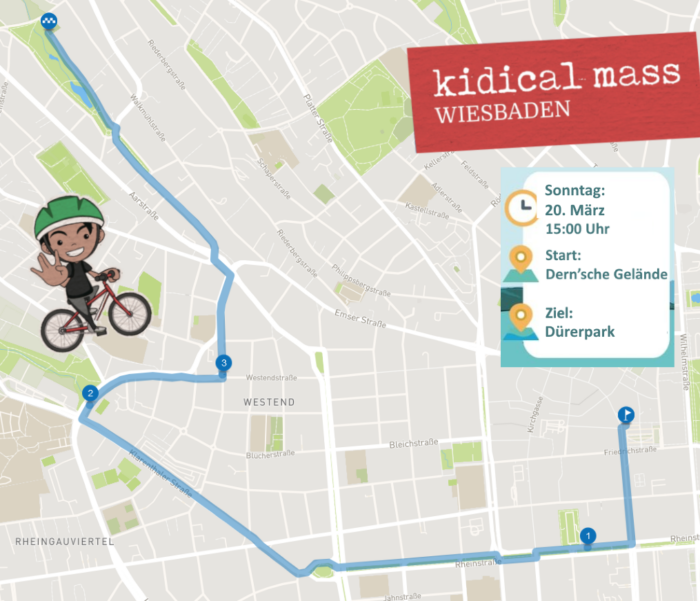 Die dritte Kidical Mass Wiesbaden 2025 findet am 21.09. um 15:00 Uhr im Rahmen der weltweiten Kidical-Mass-Aktionstagen statt. Gestartet wird wieder auf dem Dern’sches Gelände. Rund um das Rathaus und besonders auf dem Schloßplatz wird der Weltkindertag von 13:00 bis 18:00 Uhr gefeiert. Wir enden diesmal in der Grünanlage im Nerotal, wo uns der Eiswagen wieder mit Eis versorgen wird. Begleitet werden wir wie immer durch Polizei und Sanitäter.